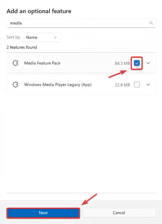- Search for Media Feature Pack, select it, click Next, then click Add.