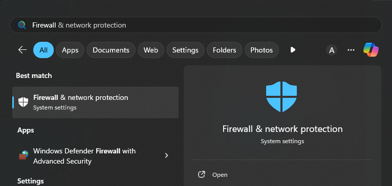 - Search Firewall & Network Protection in the Windows search bar.