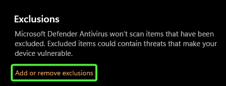 - Now scroll down until you find the Exclusions section, then select Add or remove exclusions.