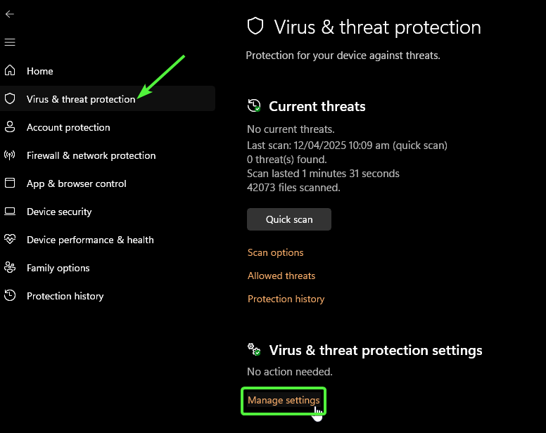 - Under the Virus & threat protection settings section, click on Manage Settings.