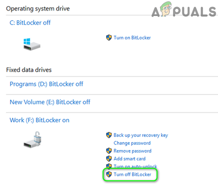 Click on Manage BitLocker - Now, in front of the target drive, click on Turn off BitLocker (if enabled) and then follow the prompts on your screen to disable BitLocker (the decryption may take some time depending on the size of the drive).