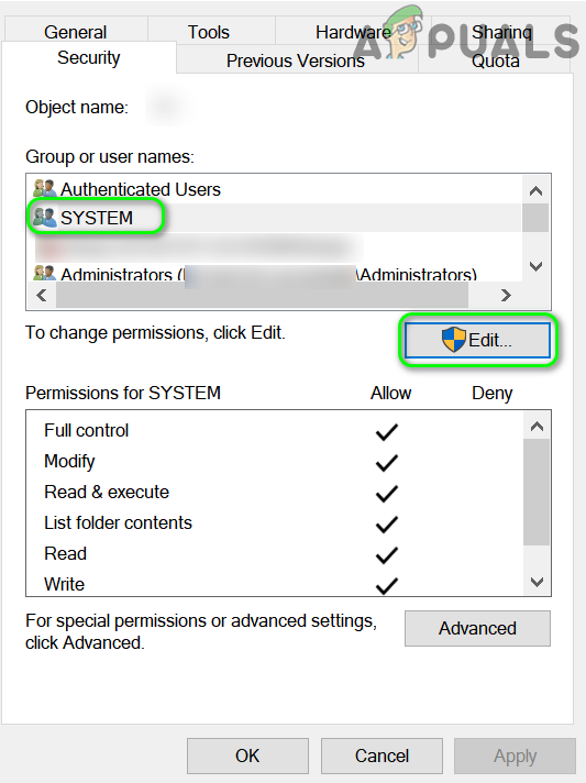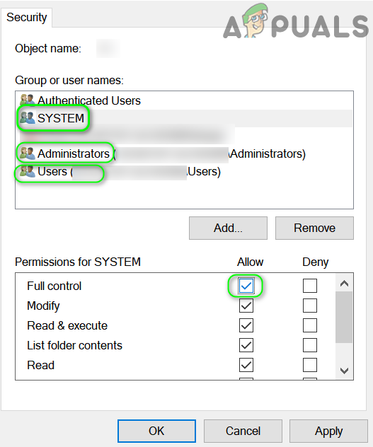 Edit Security Permissions for System Account for the Target Device - Then click on the Check box of Allow in front of Full Control and click on the Apply button.