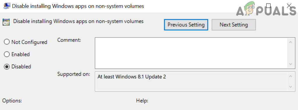 Edit the Disable Installing Windows Apps on Non-System Volumes Setting - Then choose Disabled & click on Apply/OK buttons.
