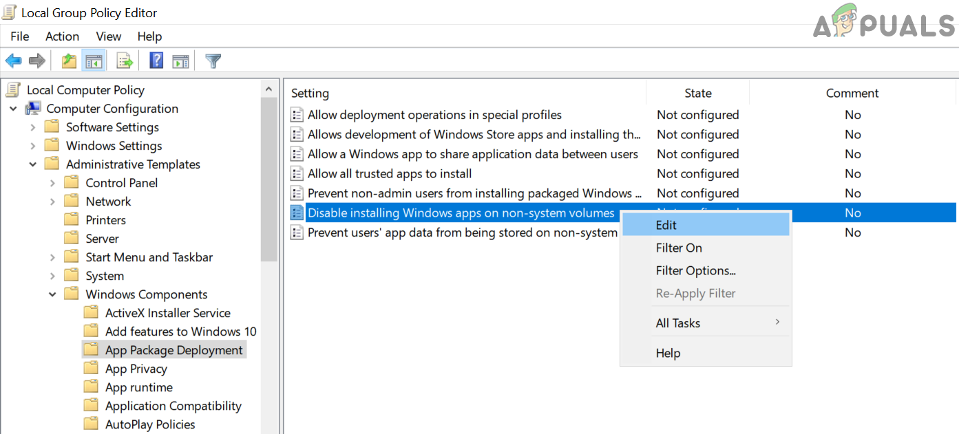 - Now, in the right half of the window, right-click on Disable Installing Windows Apps on Non-System Volumes & select Edit.