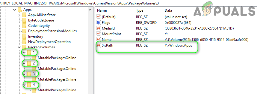 - Now, in the left half of the Registry Editor, expand PackageVolumes and check if there is more than one entry (i.e. 1 & 2). If so, then open both entries one by one and check the SISPath. Then delete the one which is referring to your target device (not to C drive) & exit the Registry Editor.