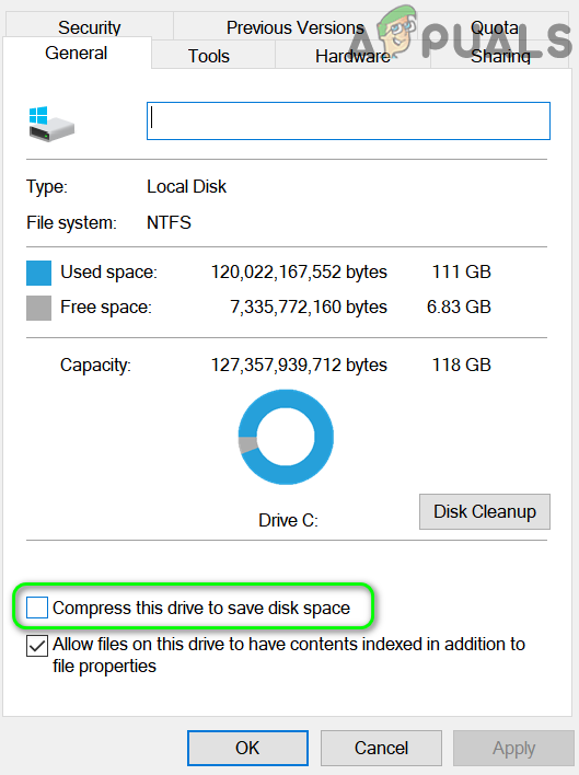Disable Compress This Drive to Save Disk Space - Now, click on Apply/OK buttons. Then open the target drive and right-click on the WindowsApps folder, if the folder exists (you may have to enable viewing of hidden file/folders and protected operating system files).