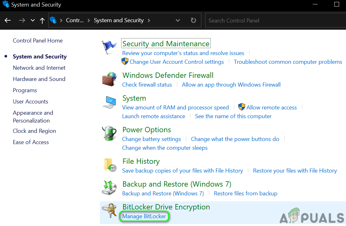 - Then open System and Security and click on Manage BitLocker (under BitLocker Drive Encryption).