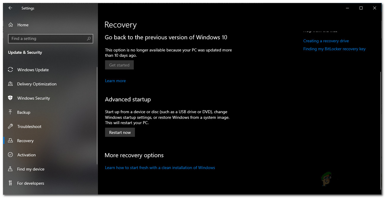 Windows Settings - On the Update & Security screen, go to the Recovery tab on the left-hand side.