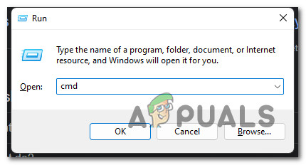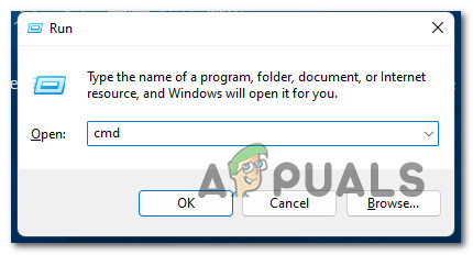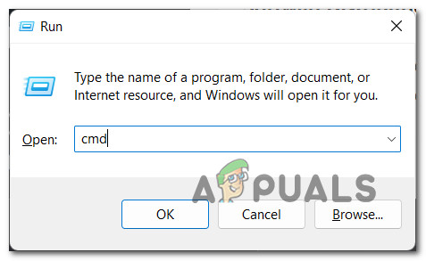 - Press Windows key + R to open up a Run dialog box. Next, type ‘cmd’ inside the text box and press Ctrl + Shift + Enter to open up an elevated Command Prompt with admin access.