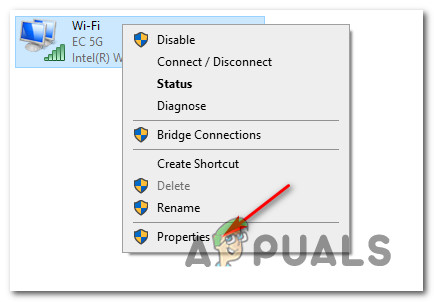 Opening the Network Connections window - Inside the Network Connections window, right-click on the connection that is currently active and click on Properties from the context menu.