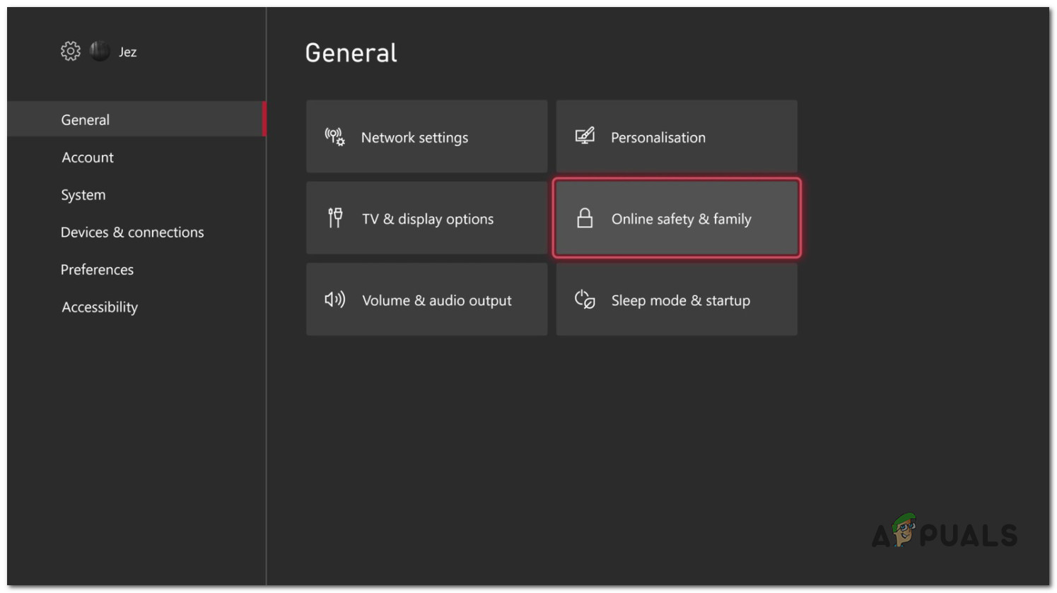 Accessing the Settings menu - Once you’re inside the Settings menu, access the General tab from the menu on the left, then access the Online safety & family menu.