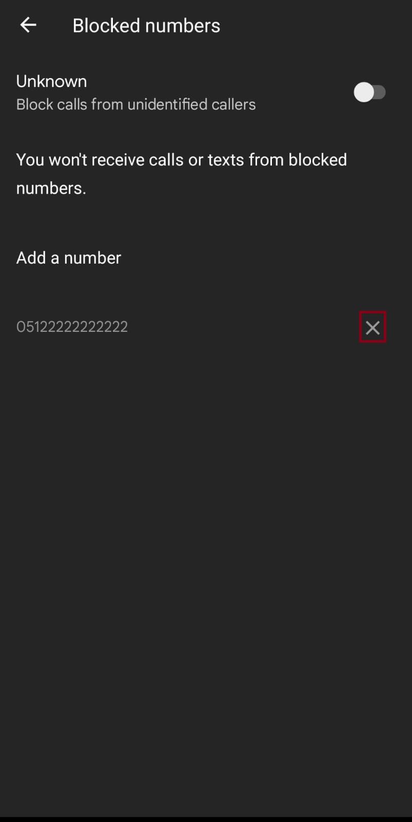 X icon next to a blocked number - Tap the “X” icon, then tap Unblock to remove that number from your blocked list.