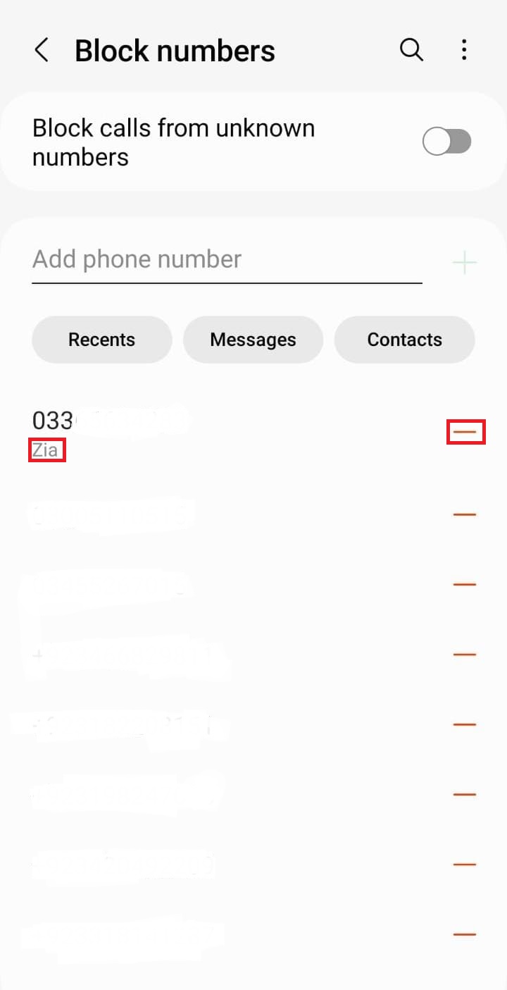 - Every blocked number will have a “–” sign next to it. Tapping this symbol will immediately unblock the number—no extra confirmation needed.