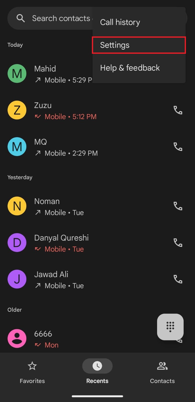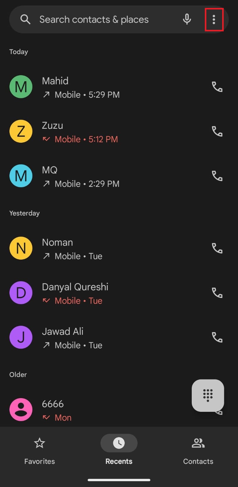 - Open the Google Dialer app and tap on the three dots icon at the top right corner of the screen.