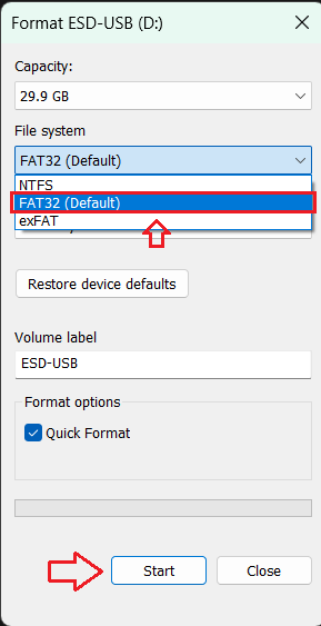 - Choose a file system (for a general clean format, FAT32 is fine if available) and click Start.