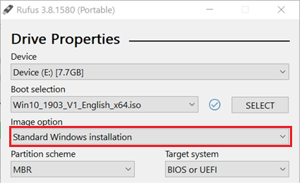 - Under Image option, select Standard Windows installation (if it isn’t already selected).