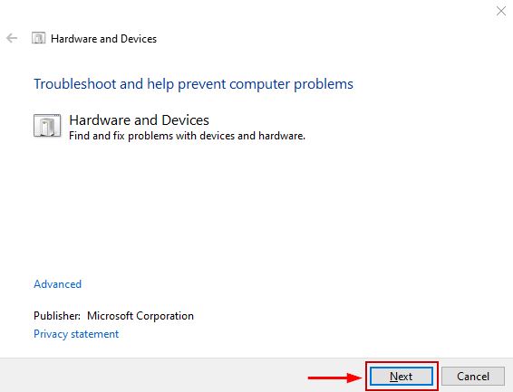 Running the Hardware and Devices troubleshooter will further identify the corrupt hardware device generating this error. This troubleshooter will determine the issue and guide you on how to fix it.