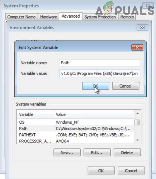 - Add the Java path in the environmental variables of the system (at the end of the path in the Temp variable). Usually, it is: