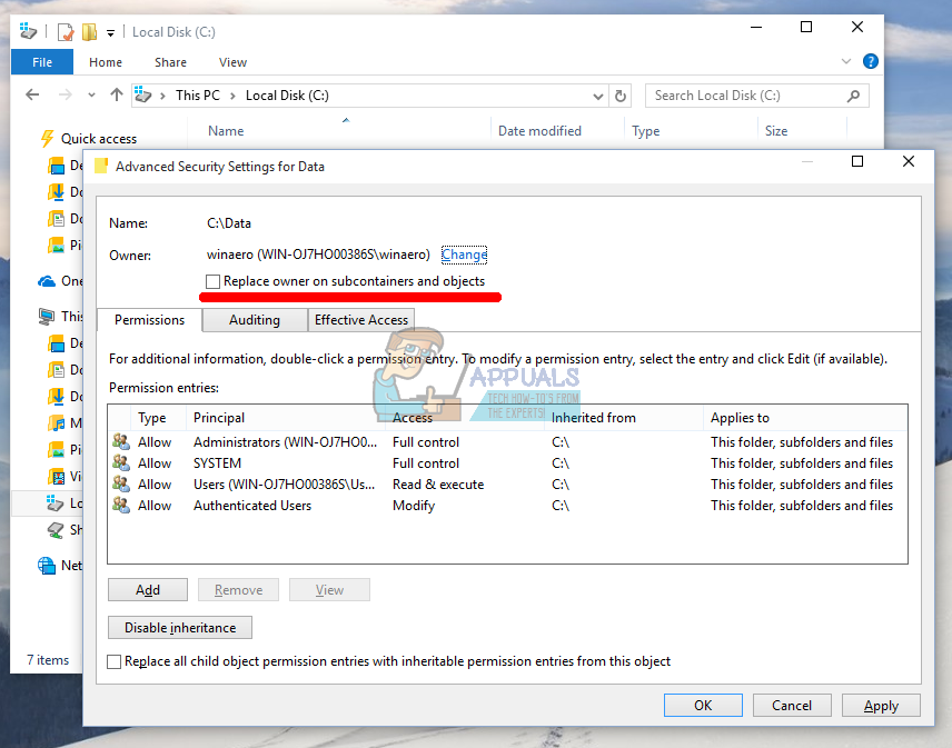 Click on “Change” and select the account you want to become the owner of the folder. After you click “OK”, you should check the box next to the “”Replace owner on subcontainers and objects” message in order to gain ownership over files and folders in the Cygwin folder.