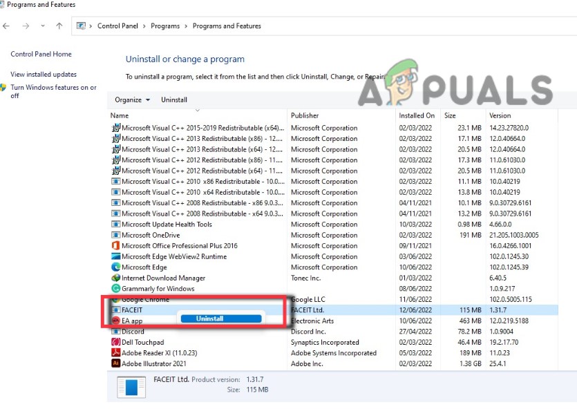 Uninstallation through the Control Panel - Select the faceit software can click the Uninstall option. Wait for a few minutes until uninstallation is complete.