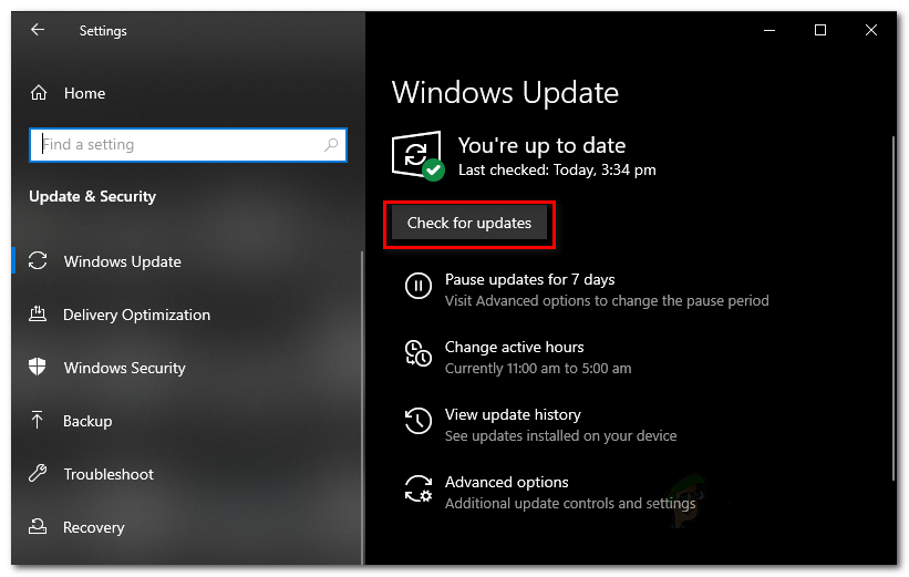 - Once you are on the Windows update tab, hover to the right-hand side and then click on the ‘Check for Updates’ button.
