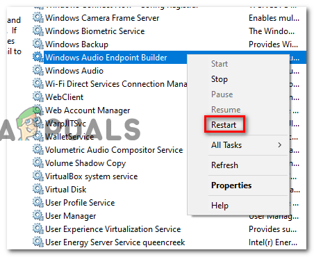 However, this error can also be caused by two services (Windows Audio and Windows Audio Endpoint Builder) that might be stuck in a limbo state. If this scenario is applicable, you should be able to fix the issue by restarting them individually.