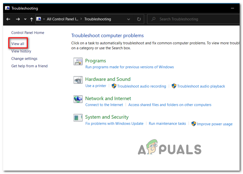 Accessing the classic troubleshooting menu - Once you’re inside the Troubleshooting window, click on View All to see the full list of available troubleshooters.