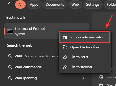 - Press Windows + S, type “cmd”, right-click it, and select Run as administrator.