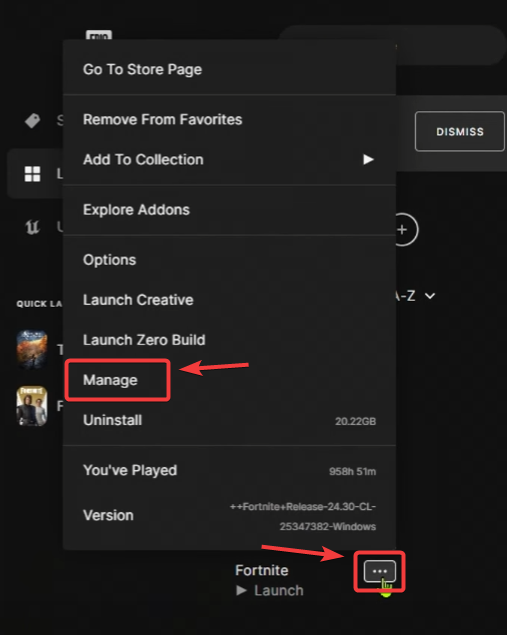 - Find Fortnite, click the three dots, and select Manage.