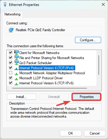 - Select Internet Protocol Version 4 (TCP/IPv4) and click Properties.