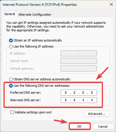 Preferred DNS: 8.8.8.8 Alternate DNS: 8.8.4.4