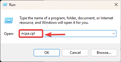 - Press Windows + R, type “ncpa.cpl”, and press Enter.