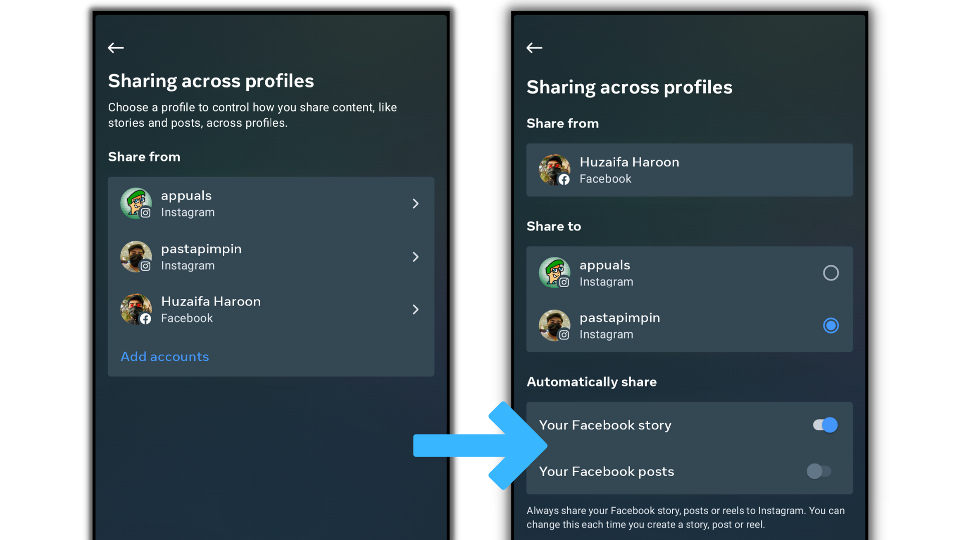 - Under “Automatically share“, choose whether to automatically share your Instagram stories and posts to Facebook.