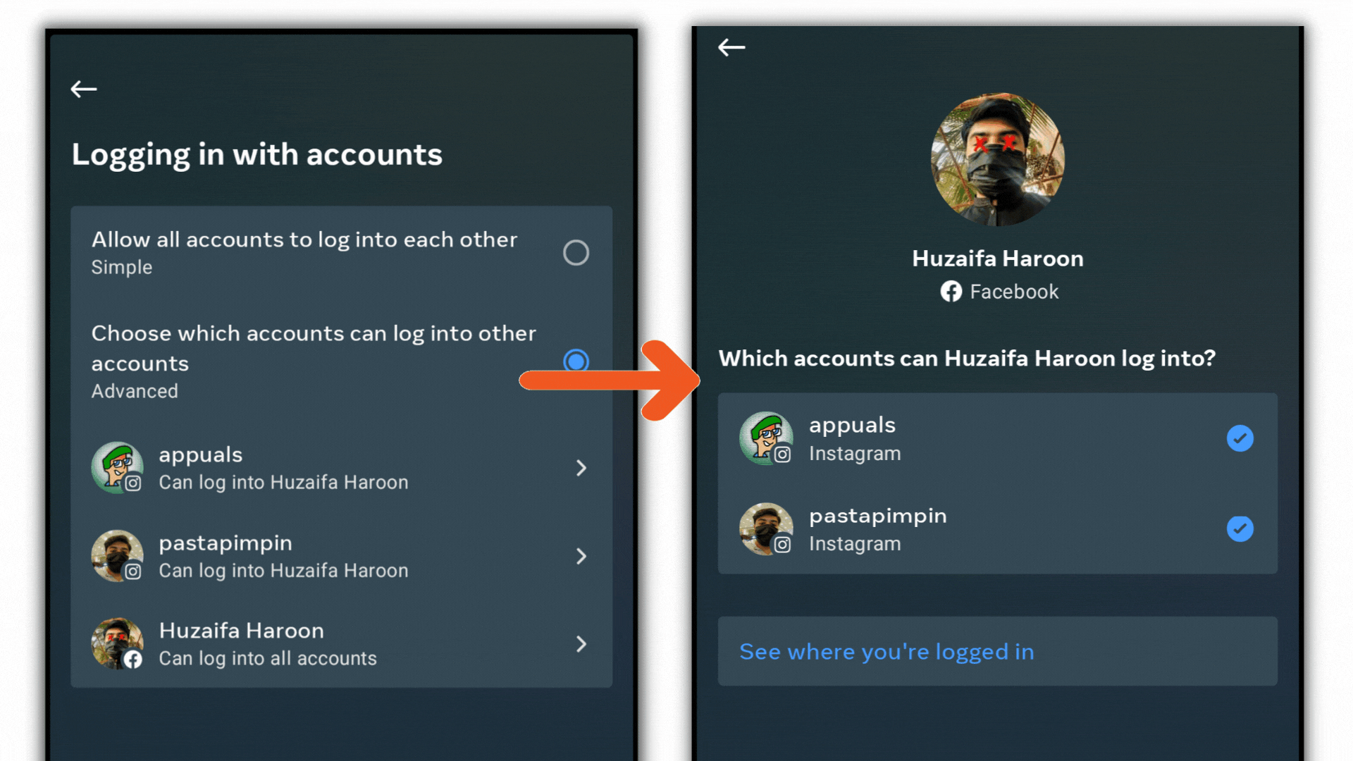 The Advanced method provides greater customization. You can control which accounts have permission to log into others individually by selecting an account and toggling access. This ensures you maintain precise control over your login and security preferences.