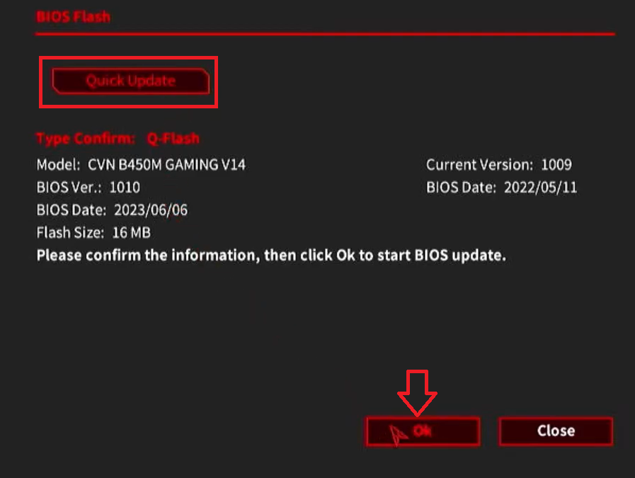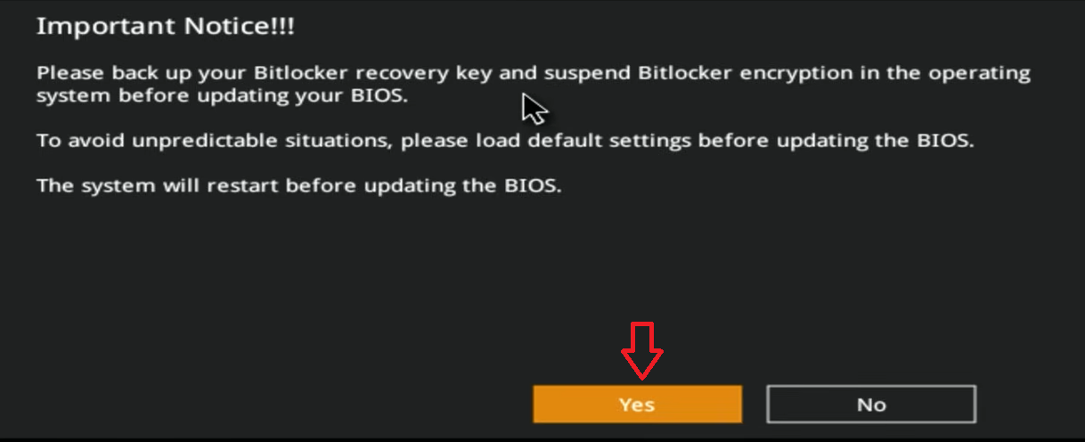 - Confirm the update, and the BIOS will start updating automatically. Do not use the PC during the flash and avoid background tasks that could trigger a restart.
