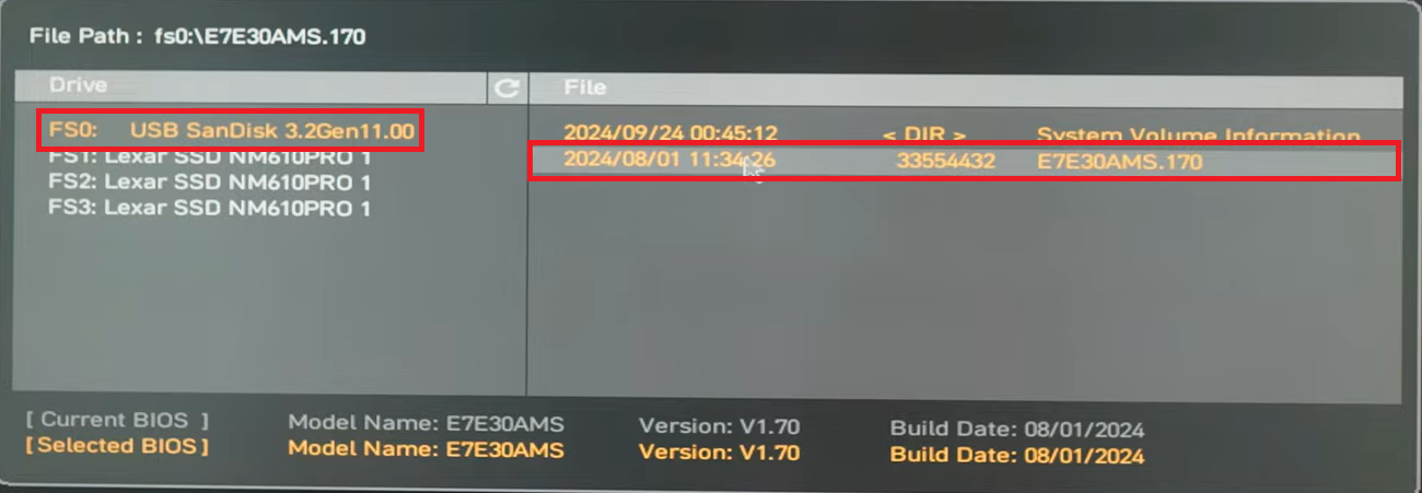 - Once the system enters M-Flash mode, select the BIOS file from the USB drive.