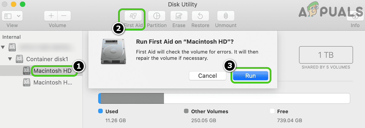 If the directory structure of your disk or disk is having some errors, then the Mac may throw the USB error at hand. Here, using First Aid in the Disk Utility to repair the disk errors may solve the problem.