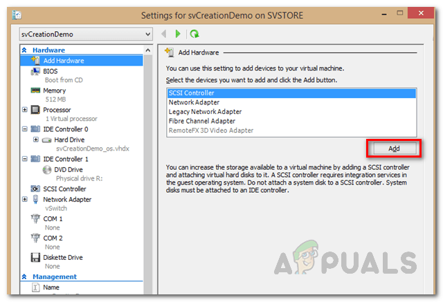- On the Add Hardware tab, select SCSI Controller from the list and then click the Add button.