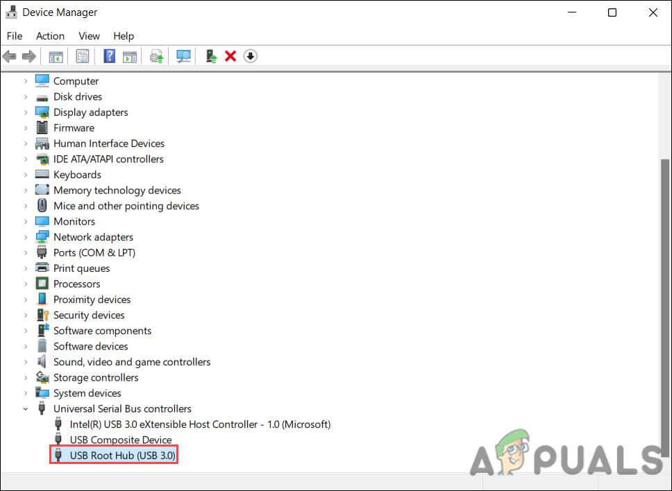 - In the Device Manager window, expand the Universal Serial Bus Controller section and right-click USB Root Hub.