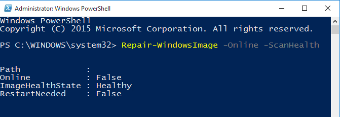 Repair-WindowsImage -Online –ScanHealth