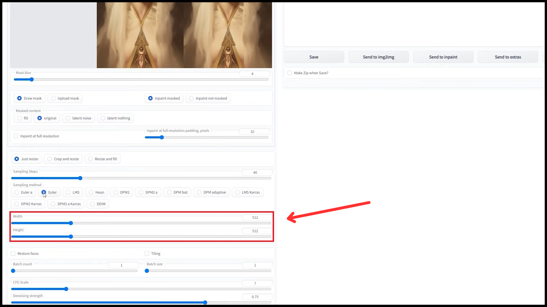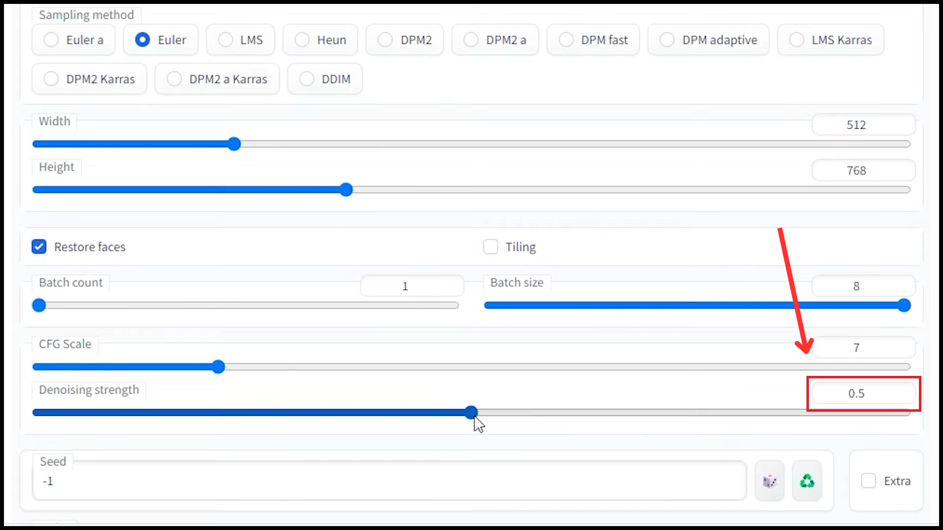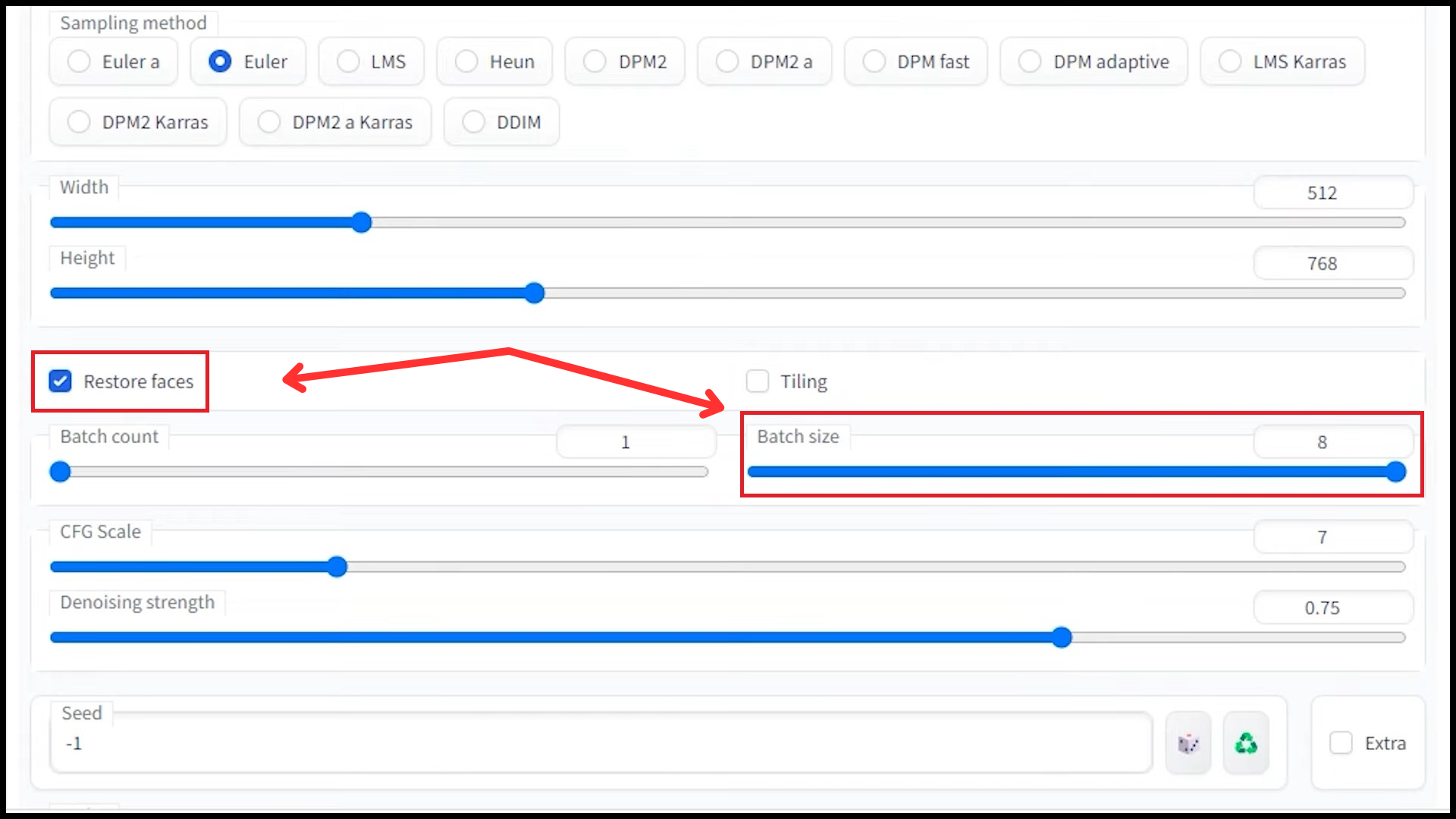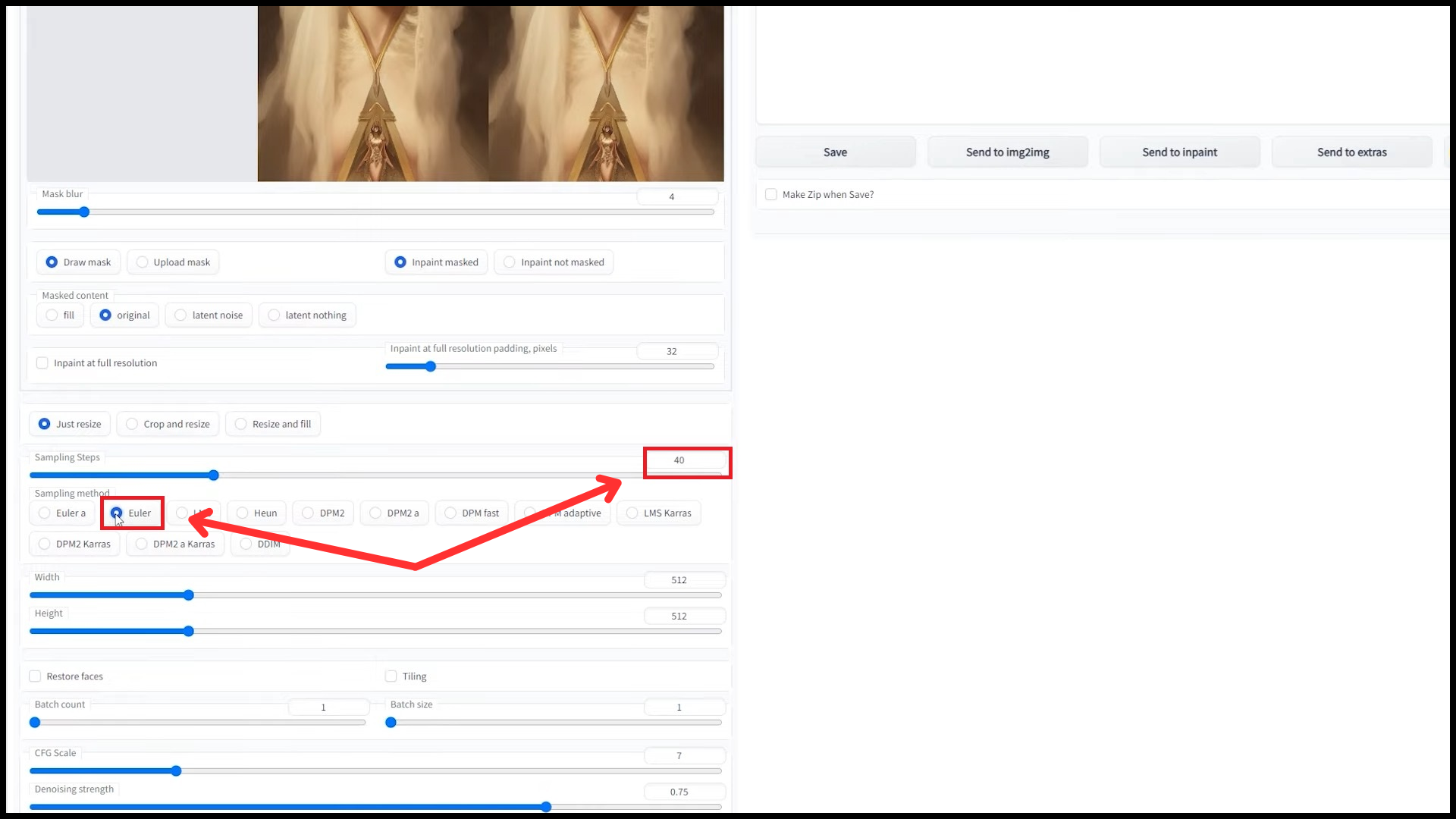 Set the sampling steps to 40. This tells the tool how many times to try and fix the eyes. Then, select the “Euler” method. Using this procedure, you can figure out the approach taken to sample and adjust the image.