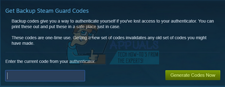 - Now Steam will ask you to use the current Mobile Authenticator code and enter it in the dialogue box. Open your Steam application on your mobile and navigate to the Steam Guard section as described above. Enter the code you see there and click the button Generate Codes now.