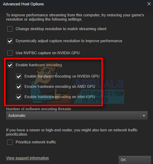- Now click on the option which says “Advanced Host Options”. After the new menu appears, check all the boxes which enable Hardware Encoding.