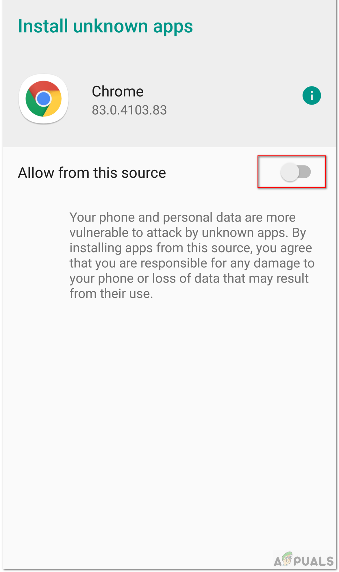 - If you get pop up saying that your phone cannot allow installation of unknown apps from this source, then click Settings and select Allow from this source option. This option allows you to download APK’s from your browser.
