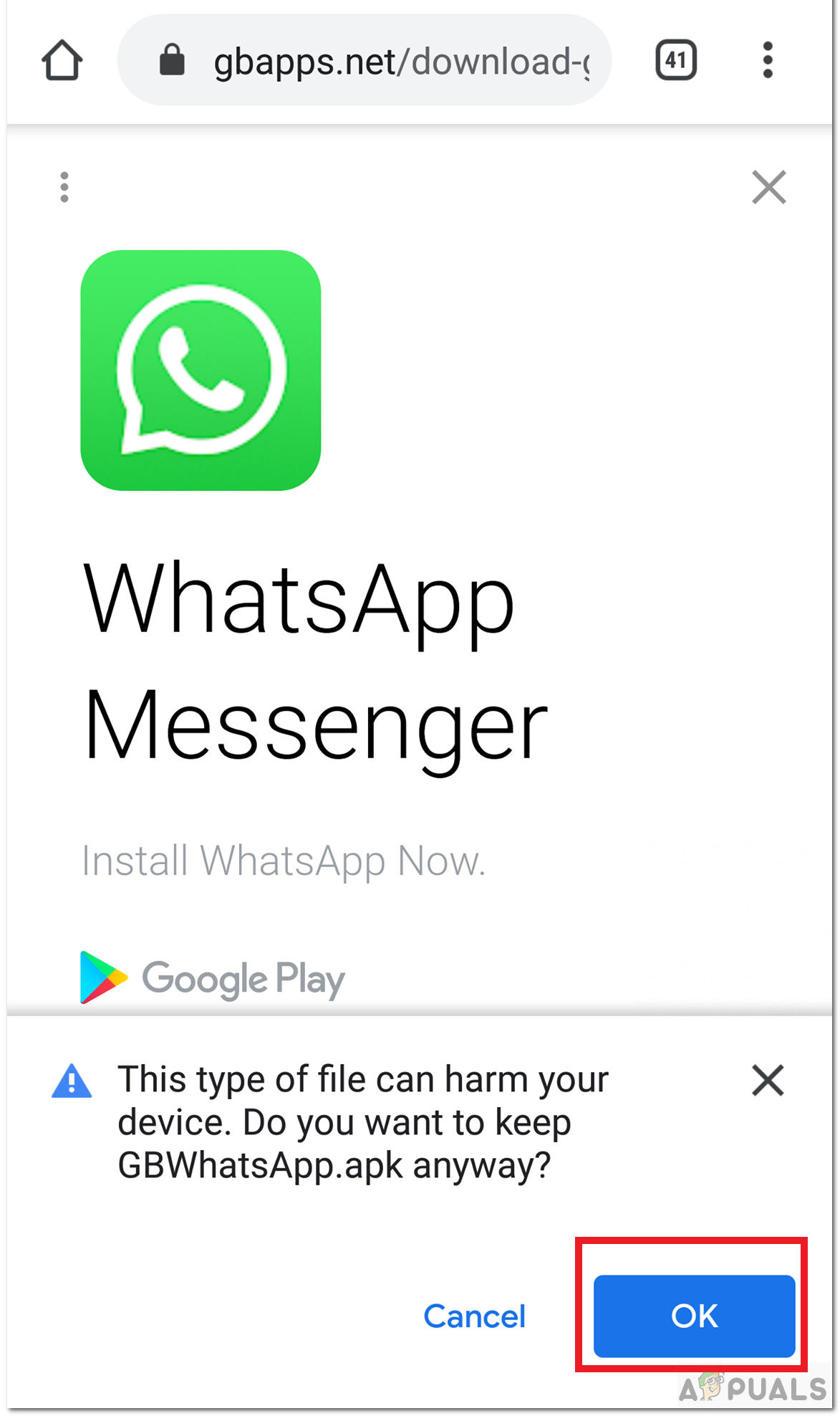 Download GBWhatsapp - Your phone will tell you that the app you are downloading can harm your device and if you still want to keep it. You can skip that and choose OK. The download will start.
