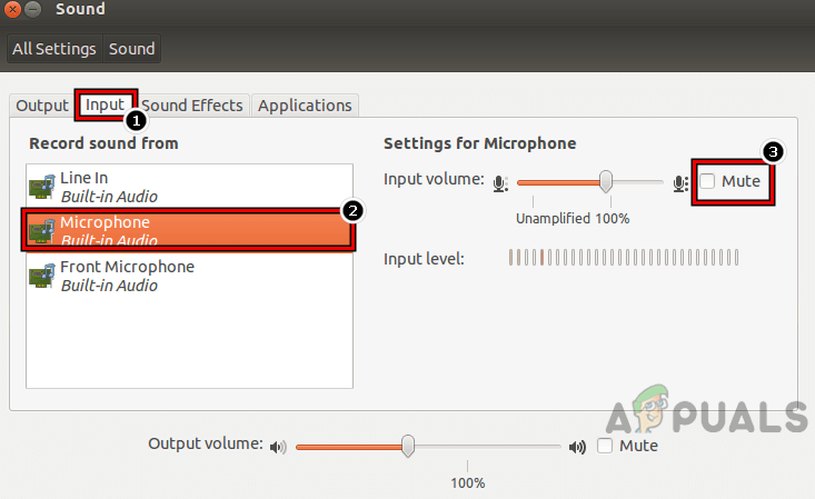 Open Sound Settings of the Linux PC - Now steer to the Input tab and in the Record Sound From section, choose the Microphone and unmute it (if muted).