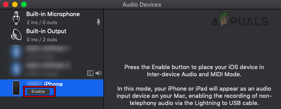 Open Utilities in the Mac’s Applications - Then open Audio MIDI Setup and in the left pane, click Enable (under iPhone).