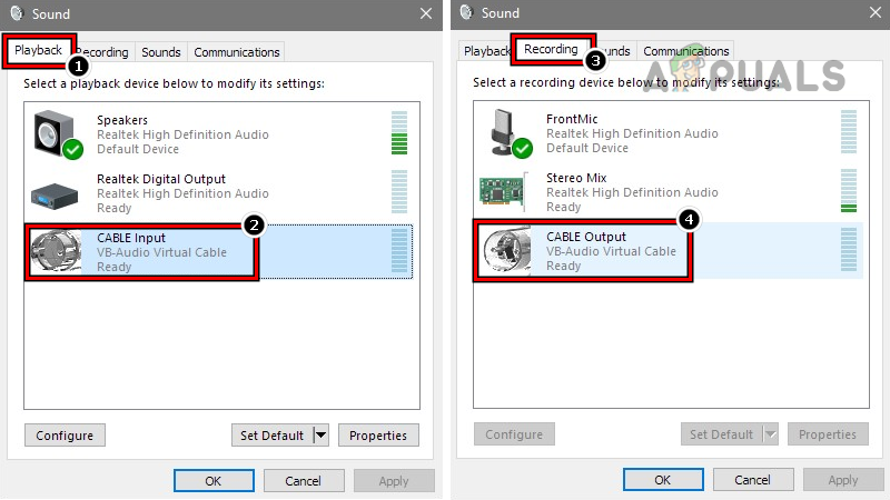Cable Input Device in the Playback Tab and Cable Output in the Recording tab of the System’s Sound Panel