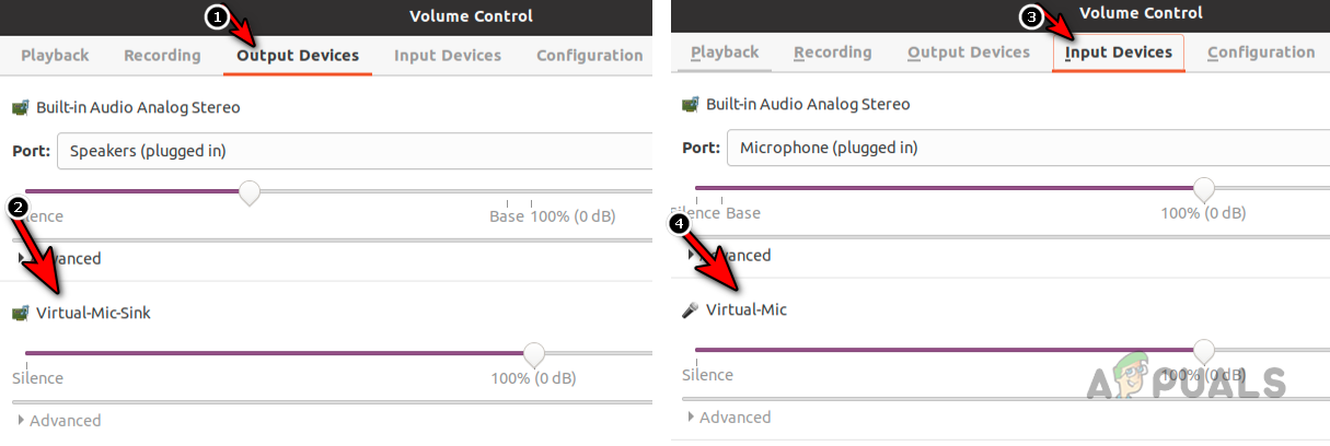 Virtual-Mic-Sink in the Output Devices and Virtual-Mic in the Input Devices in the Linux Volume Control