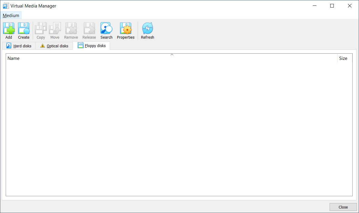 If you click on the Floppy disks, you will see all the floppy disks associated with the virtual machine. As floppy disks are not really used anymore, you will not see them so often. In the toolbar, you have the same options as the options available for hard disks. The only difference is that they are used for the floppy disks (create a new floppy disk, copy the floppy disks).